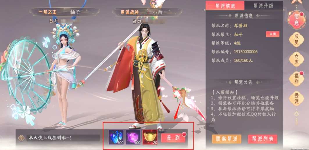 首先是帮派签到,加入帮派后,每天可以在帮派中进行签到,可以领取到元宝奖励和仓库积分噢~后续仓库积分还能去仓库兑换自己想要的装备,白嫖的元宝,还不快快来签到领取!