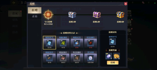 2、公会捐献功能,日常刷图会掉落捐献材料(账号贡献的,可以用小号刷材料,给大号用:),达到累计材料可以进行捐献,每种材料每日仅可捐献一次,当日累计3次、6次、8次,可以获得额外奖励,推荐集齐8种材料再捐献