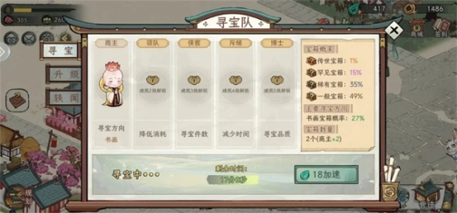 随着寻宝队的升级,队伍里最多可以拥有5个队员。商主、领队、侠客、斥候、博士,分别负责寻宝方向、降低消耗、寻宝件数、减少时间、寻宝品质的职责。