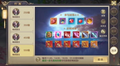 深渊魔王每天定时刷新,参与BOSS击杀的玩家都可获得奖励,对BOSS造成最后一击的玩家与对BOSS造成最高伤害的玩家均可获得珍稀奖励,如酷炫的武器外观!