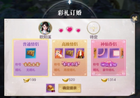 成为仙侣,与异性好友亲密度达到520后,即可进行结婚,完成结婚流程一共有3个步骤。首先,一方要提出彩礼订亲,系统有3个不同档次的彩礼可以选择,赠送彩礼后仙侣双方都可获得奖励。