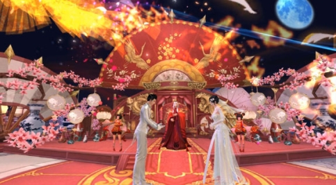 盛大的跨服婚礼,还有堵门、抢绣球和拼酒等有趣玩法,华丽非凡,羡煞三界!