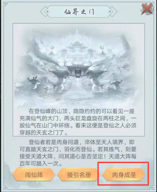 然后闯荡过了20关,在仙界之门选择肉身成圣,这里选择肉身成圣的玩家必定会经历比接引飞升玩家更多的修炼时间,20关肯定不在话下,不再赘述。