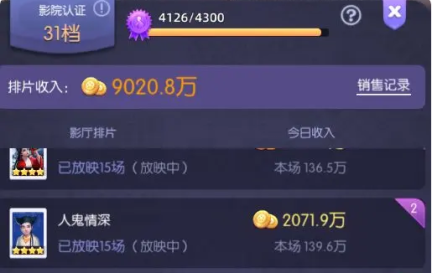 3、玩家可以通过每日盈利的影院资金,可以达成各档评价,可以获取能够提升电影票房的粉丝;