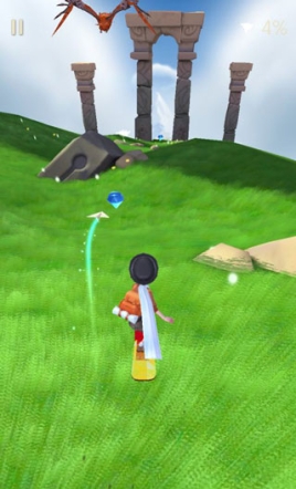 5、场景中会有单个的高台,上边有蓝色的标识,这也是弹跳的标识,跳起来之后控制左右方向,然后跳动到下一个落脚点,有时候高台中的台阶会进行变化,在变化的同时要迅速做出判断,滑动的快点基本没问题。
