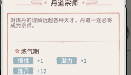 1、我们选择的天赋会影响掌门的战力,当然也会影响炼丹、炼器收益,如果你想要让掌门当主C,推荐选择“先天灵脉+武道巅峰”,在其他情况下,推荐选择“丹道宗师+器道宗师”。