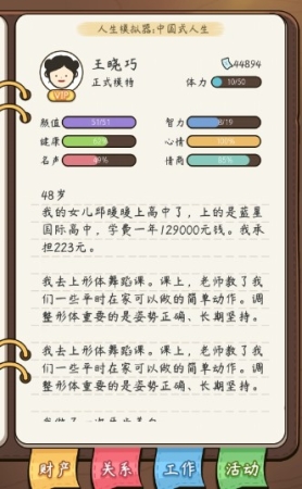 中国式人生无广告版属于那种特别好玩的人生模拟类游戏。在这个游戏里,玩家能拥有全新的一段人生。主角从生下来一直到死亡,整个人生全由玩家来把控。不管是学习、工作,还是恋爱、结婚、生孩子等人生大事,都会因为玩家的选择不一样而出现不一样的结果。