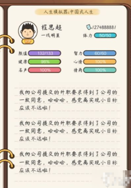 4、毕业开始求职了,应聘你想要的职业,从最低岗位开始(每年2次加班,3年后就能升职加薪了)后续升职与你的属性有关。关于成年后的名声和情商,我这里简单说下,名声做慈善来得快,钱少可以1万1万的捐。情商得看几率,健身、事件都有几率加情商。颜值、智力、健康和心情可以在健身里刷(推荐普拉提和维密)。