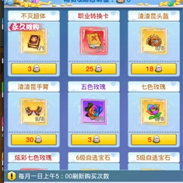 魔王森林卷轴 2张 每天买!挖矿的工具 每天买!护送公主的水晶鞋 每天买!祝福水晶 每天买! 吸怪磁铁和暴富卷轴 缺了才买!强化石和眠火石 不推荐买。铠甲宝石和三本魔邪书,那是后期的事情了。