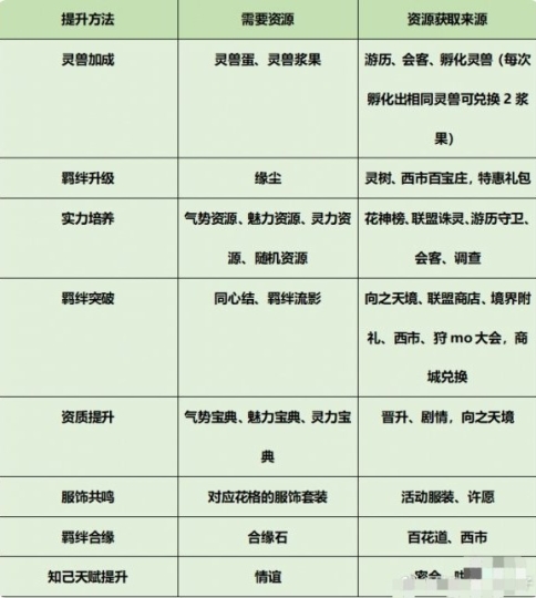 1.资源积累/完成每日任务来源根据表格进行资源积累,提升羁绊战斗力