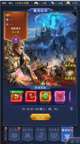 魔狱战场开启时间为每周二、四、六开启,所有开启功能的玩家都可参与,该玩法以军团为阵营,没有军团的玩家也可进入战场。玩家进入战场后,每参与一定时长可获得一定积分。