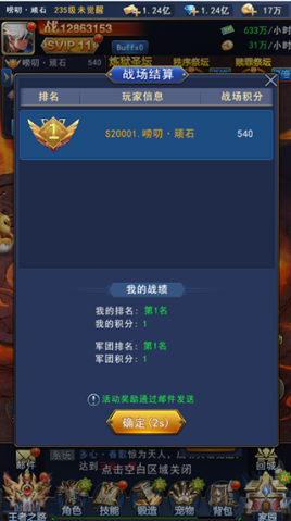 击败玩家和助攻玩家,可获得积分。连续死亡5次及以上,可获得一个连续死亡BUFF,击败一名玩家后,取消该BUFF,该BUFF可与钻石复活BUFF叠加。而军团团长、副团长、精英在祭坛范围内时,可使用军团集结令,使用后,该军团的队友都可收到一条集结气泡,点击气泡,可集结到该玩家位置。