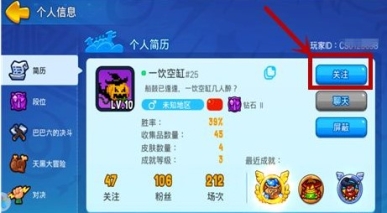 进入后,点击关注,即添加成功,可以私聊他,让他也关注你,这样双方即可随时开黑了。
