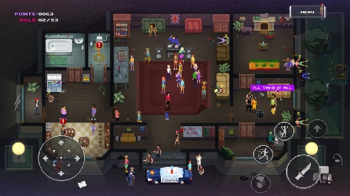 疯狂派对 GO 全角色解锁版属于从 Steam 平台移植过来的一款手机游戏,是暗杀题材的冒险解谜类型。游戏里的时间设定在半夜三点,玩家正睡得香呢,结果被可恶的邻居吵醒了,这邻居大半夜居然在开派对。玩家哪能受得了,那就行动呗。玩家得悄悄潜入邻居家里,运用各种手段把参加派对的宾客一个一个暗杀了,还得妥善藏好尸体,千万小心别被警察发现,不然就得吃牢饭啦。