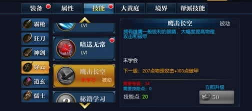 5.鹰击长空:拥有雄鹰一般敏锐的眼睛,大幅度提高物理攻击和破甲。