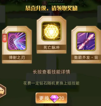 杀掉怪物,通过关卡,升级后会出现随机冒险技能,也可花费钻石更换技能,因为在同一章节可以继承冒险技能,所以遇到好技能千万不要手软。