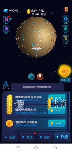 2、然后我们进入到升级页面,在这里可以消费金币来升级一些buff,它们包括增加离线收益率、离线时间、点击能量等,合理的升级会使我们的建造工作事半功倍。