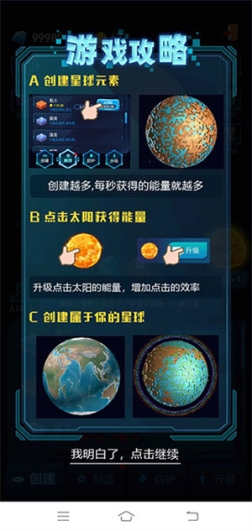 4、打开游戏的帮助界面,我们可以看到一些小提示,我们可以创建星球元素,创建得越多,每秒获得的能量就越多,我们还可以点击太阳获得能量,如果升级点击太阳的能量,可以增加点击的效率,然后就可以创建属于你的星球了。