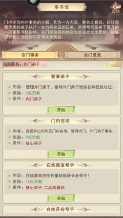 门派事务堂中可执行门派事务获得贡献,门派职务越高可执行的事务获得的门派贡献越多。门派每百年会发布宗门悬赏完成悬赏也可获得门派贡献。