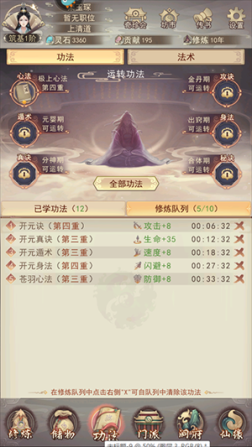 学习并修炼功法是最主要的属性获取方式,在聚灵阵中升级灵根可进一步加强功法效果。