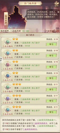 炼制丹药和法宝需要学习相应的丹方和图纸,并达到一定的炼丹,炼器等级。丹方和图纸可从门派中的炼丹房及炼器室中消耗贡献学习,也可通过其它手段获取。提高炼丹房炼器室中火焰,炼丹炉,炼器炉,道童以及自身炼丹术和炼器术的等级,可以获得更好的炼丹和炼器效果。