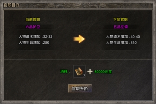 官职的晋升是游戏的一大特色,游戏从平民开始,通过获得游戏内的官职晋升材料,完成官职的晋升,同时在晋升官职的时候也会伴随人物属性的提升。