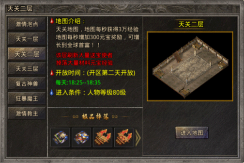 3、天关二层:地图每秒获得3万经验,每秒增加300元宝,可增长到全球首富,开区之后的第二天开放,在每天的18:25-18:35开放进入,进入条件人物等级达到80级即可。