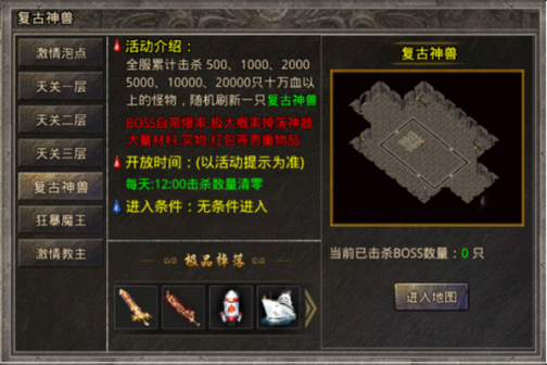 5、复古神兽:全服累计击杀500、1000、2000、5000、10000、20000只10万血以上的怪物,随机刷新一直复古神兽。BOSS自带爆率,极大概率掉落神器大量材料,实物,红包等物品。开放时间:以活动提示为准,每天12:00击杀数量清零,无条件进入。