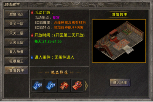 7、激情教主:必爆神器及稀有材料,附加各种BUFF伤害,开区第二天开放,每天21:25-21:55开放,无条件进入。