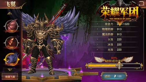 “飞翼”系统玩法十分的炫酷,我们在满足一定等级后会获赠一款初始一阶飞翼,人物在装备后可以获得攻击力、物理防御、魔法防御等等诸多属性的永久加成,可谓一大神器,飞翼可通过消耗烈焰宝石来进行升星操作,当飞翼升星到达10星则开启进阶功能,可通过消耗神圣之羽进行进阶操作,都可以永久提升飞翼的附加属性;而飞翼进阶之后,飞翼形态也将发生改变,属性也将大幅度的提升。