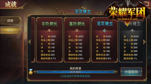 军衔系统是角色提升战力的又一途径,军衔会增加角色的生命值、攻击上限、属性攻击等。但提升军衔则需要先获取荣誉值。荣誉值则是达成成就之后获得的奖励,伴随角色不断的成长,会达成特定的成就,就会获得荣誉值以及钻石奖励。是用来提升军衔和获取道具最有便捷的系统。