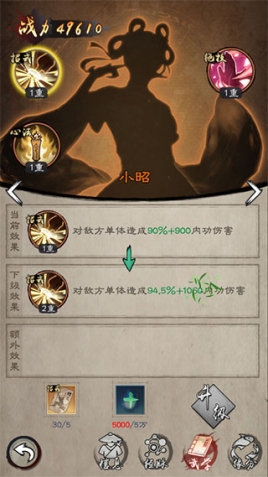 招式与心法升级后能提升该技能的伤害或增减益的数值效果,绝技升级后达到一定重数会激活绝技的增强效果。