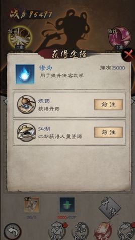 升级武学还需消耗“修为”,修为资源可通过主城-融合-炼药功能制作修为丹药服用增加,炼药材料可通过钓鱼拍卖、问答拍卖、药草副本、江湖寻宝、江湖行商、江湖门派战等方式获得。