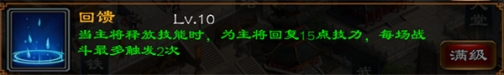 回馈,技力恢复型技能,满级效果为当主将释放技能时可恢复15点技力,每场战斗触发两次。说实话这个技能更适合放在统将和智将身上,但放在吕布身上也是有奇效的,能打多一次大招其实还不错。