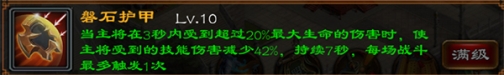 磐石护甲,防守型技能,满级后效果为当主将在3秒内收到超过20%时,使主将受到的技能伤害减少42%,持续7秒。每场战斗最多触发1次。这个技能要注意,第一次超过20%的伤害是不算在技能伤害的见面里面的,所以这个技能并不能阻止秒杀型技能,而且就算受了一个秒杀型技能后还没死,估计也差不多了。所以这个技能实用性也不大。