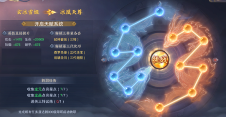 二转后将成为玄冰雪姬,普攻伤害提升20%;新增职业特色被动技能,新增一个技能孔槽;解锁新装备栏;开放新翅膀、法宝化形。