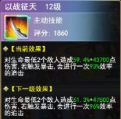 以战征天(12级):对生命最低2个敌人造成59.4%+43700点伤害,若触发暴击,会进行次93%效率的追击