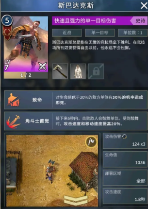 6.斯巴达克斯,紫卡里相对强力的对单单位,优秀的血量和致死能够单杀7费的7.8级阿基里斯,对数量多的单位效果差。一般我侧面出,拉到对面后排高价值单位(6费女武神.弩车等)帮正面缓解压力。