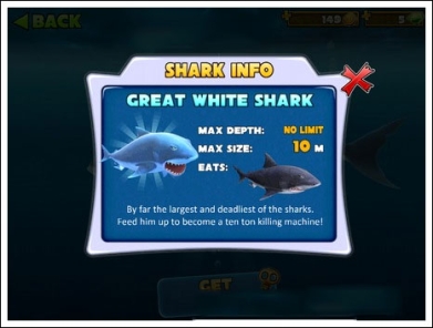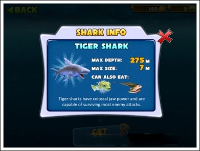 5、逐渐解锁更多水下凶猛野兽:灰鲭鲨、锤头鲨、虎鲨和无敌的大白鲨!