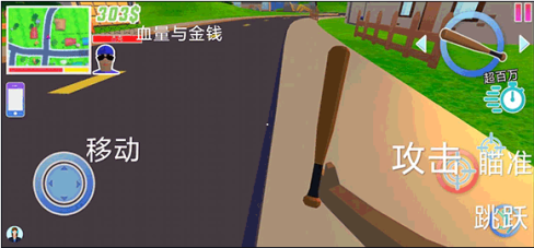 2、在它的下方有一个手机标识和移动轮盘,玩家可以通过手机标识进行换装,购买物品等等有趣的功能,移动轮盘是用来控制玩家进行移动的主要按键,可以说没有它你将寸步难行;在地图的右边显示着我们现在的血量以及金钱,金钱是用来购买道具以及在游戏内游玩的主要物品,玩家尽量多多收集;屏幕的右边的按钮都是主要以交互为主的,例如攻击瞄准等功能,在中间的指针点指到物品,房门或是汽车上,玩家就能对他进行交互,拾取物品,打开房门或者启动汽车,而右上角的很大一部分的地方则是手中的道具切换,而它底下的时钟类型的图标则是玩家角色的特殊技能,非常实用。