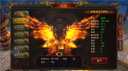 详细说明:翅膀功能开启后,同步开启了幻化功能,可以通过活动、商城购买等方式获得幻化翅膀皮肤,佩戴后不仅能变幻外形,还能增加额外的属性哦~!