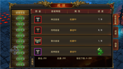 具体说明:只要收集到对应的套装完成,即可激活套装收集的属性,属性分别为暴击、抗暴、物攻下限。而当角色升级、登录、各个系统都达到一定等级时,即可激活成就,获得成就点数。