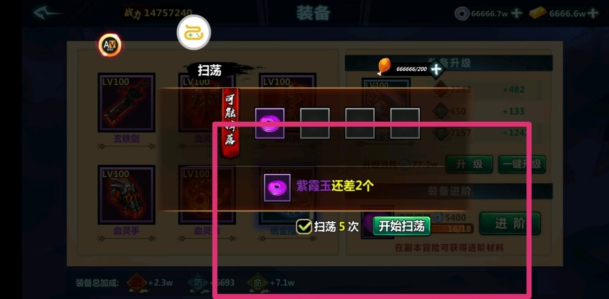 可以利用扫荡配合修改器进行快速进阶装备和刷级