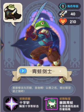 那么在勇者秘境中哪个角色最强呢,小编这里着重为大家推荐目前热度较高的角色,第一个就是青蛙剑士了,青蛙剑士的普通攻击就是技能十字斩,相当于直接领先其他角色一个技能,前期的优势非常大,同时初始秘宝还能提高攻击力,生命值越低伤害越高,在难度较高的关卡表现非常好。