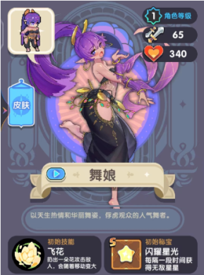 第二个就是舞娘了,舞娘是玩家在游戏前期可以试用的角色,整体实力非常强悍,初始技能飞花攻击范围大、伤害高,还可以进阶为S级技能,在各种关卡中都有非常好的表现,再加上每隔一段时间的无敌状态,让舞娘完全无惧敌人的包围,正所谓万花丛中过,片叶不沾身,是一个让BOSS绝望的角色。