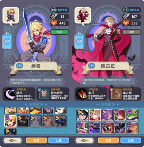 在勇者秘境中,目前的角色一共有二十个,其中包含六个B级角色,六个A级角色和八个S级角色,角色之间不仅能力值差距非常,技能方面差距也非常大,例如饱受大家欢迎的S级角色影武士,不仅可以直接攻击一条直线上的敌人,还有几率一次性选择两个技能,角色的获得可以通过酒馆的招募获得。