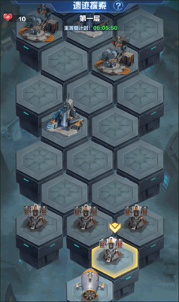 在遗迹探险中,指挥官们可通过选择格子前进,路上会有敌人、支援站、补给站等,击败敌人可获得遗迹币与加强技能,选择支援站可获得强力支援英雄(遗迹内生效),进入补给站可以回复基地血量。打过每一层的boss还可进行勋章转盘抽奖,主要产出勋章类相关道具。