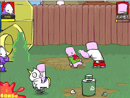 第四关:足球场。小心踢足球的小朋友扁你!尽量少用甩拳。而且记着跑到足球跟前踢着足球走!