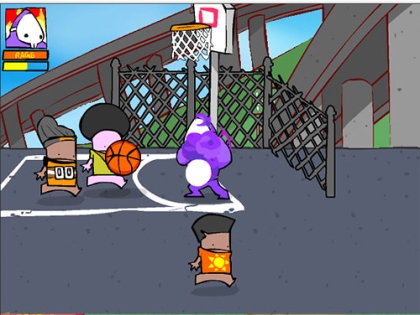 第七关:篮球场。有人会拿篮球扔你,还有就是可以在球篮下按着A按上,投篮!!!动作很有趣。记住把篮球也拍着走,以后也会有用的。要拍着篮球,推着足球。