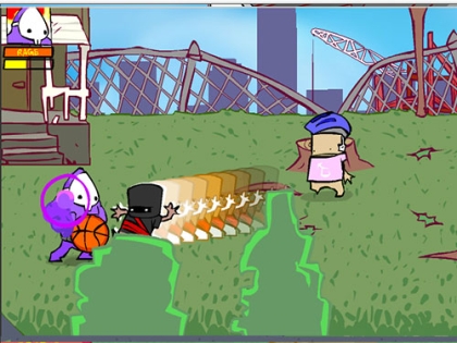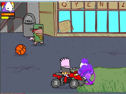 第八关:赛车道。这一关要小心开汽车的两个小孩撞你,用篮球或用足球扔他,会将车打爆,用甩拳没多大用,推荐用球打他。想冒险一下的话就等车来时用拳头揍他,也会打爆的,有一定的危险性。